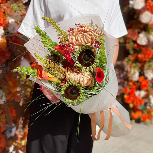 Букет "Фиеста" из подсолнуха экзотик, калины, хризантем Виена, калл, моллюцелл и эремуруса