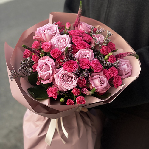 Букет "Малиновый вечер" из кустовых малиновых роз, вероники, лимониума и роз Меритим